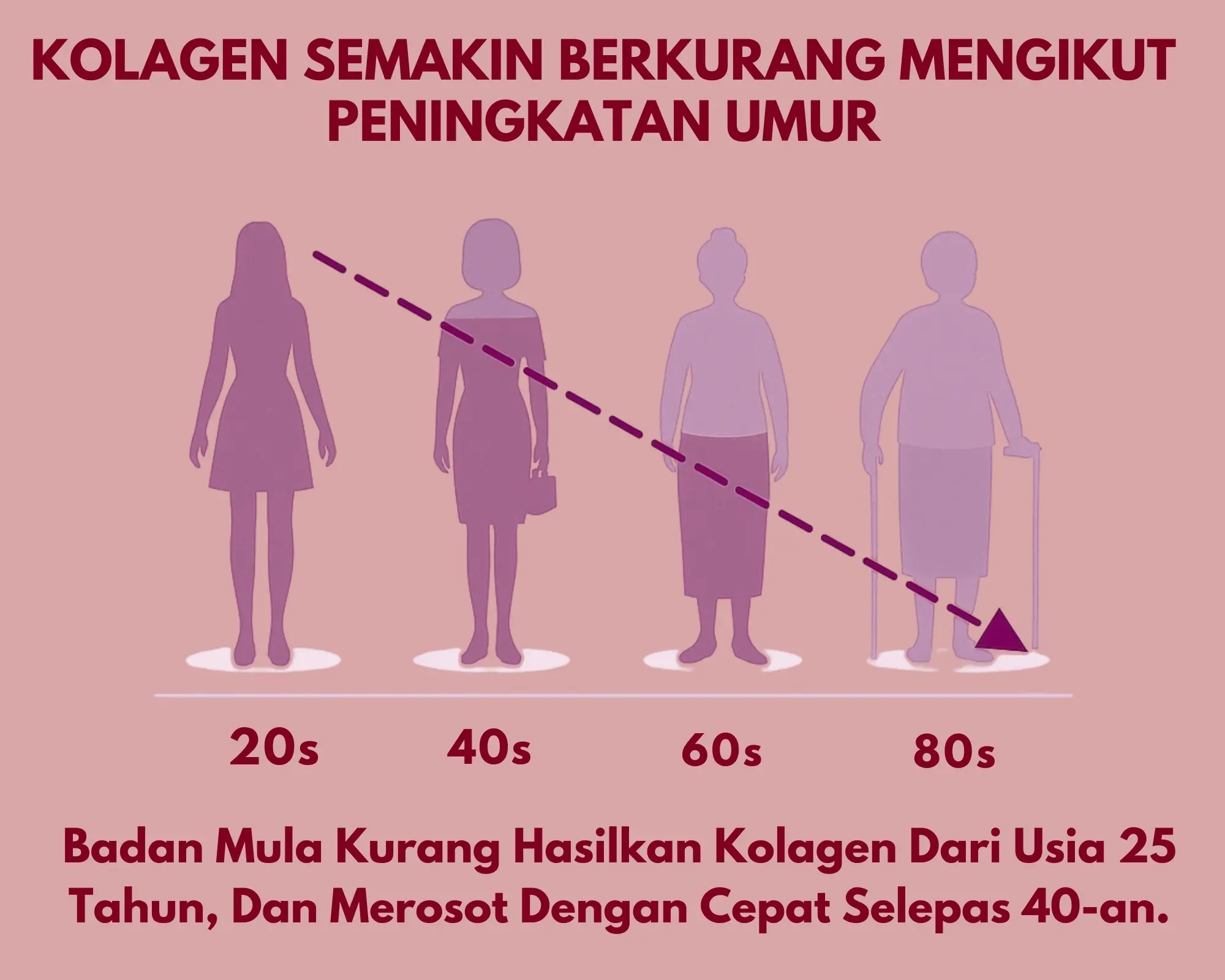 Kajian Menunjukkan Tubuh Mula Kehilangan 1% Hingga 1.5% Kolagen Setiap Tahun Selepas Usia 25 & Selepas Usia 40 Tahun Kadar Kehilangan Kolagen Menurun Secara Drastik Sehingga 30%.