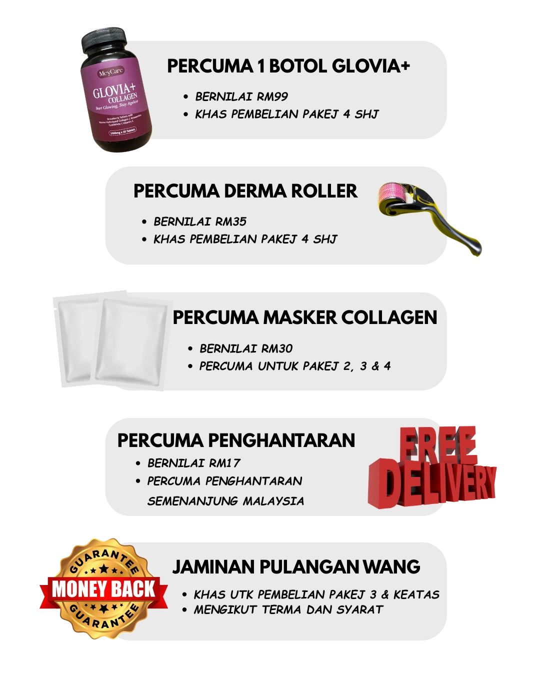 Kami yakin dengan kualiti produk Glovia+, kepuasan anda adalah keutamaan kami. Jika anda tidak melihat sebarang perubahan dalam masa 45 hari, kami akan memulangkan wang anda sepenuhnya. Tanpa sebarang risiko. Hanya untuk pakej 3 & 4 sahaja.